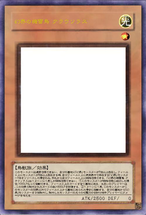 | このモンスターは通常召喚できない.自分の墓地に「幻界」モンスターが7体以上存在し,フィールド上にモンスターが5体以上存在する時,自分フィールド上に表側表示で存在する「幻界」モンスター1体をリリースした場合のみ,手札から自分フィールド上に特殊召喚できる.「幻界の機雷鳥 クラウソラス」は1ターンに1度しか特殊召喚できない.①このモンスターが特殊召喚に成功した場合,1000LP払って発動できる.フィールド上のカードを全て墓地に送る.お互いのプレイヤーは,この効果で除外されたカードの数×800LPを回復する.②1ターンに1度,このモンスターがこのモンスターの効果以外でフィールド上から墓地に送られた場合に発動する.自分の墓地から「幻界」モンスターを3体除外し,除外したモンスターの元々の攻撃力の合計分相手プレイヤーにダメージを与える. | |||