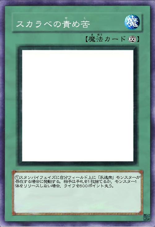 | ①スタンバイフェイズに自分フィールド上に「永遠衆」モンスターが存在する場合に発動する。相手は手札を1枚捨てるか、モンスター1体をリリースしない場合、ライフを800ポイント失う。 | |||