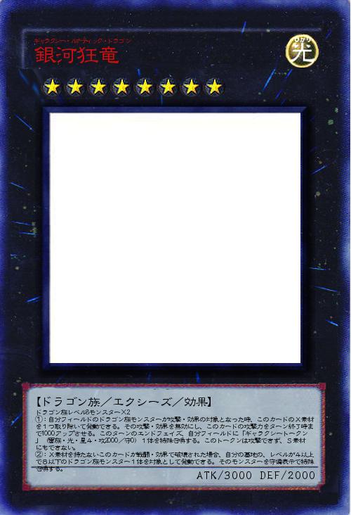 | ドラゴン族レベル8モンスター×2 ①:自分フィールドのドラゴン族モンスターが攻撃・効果の対象となった時、このカードのX素材を1つ取り除いて発動できる。その攻撃・効果を無効にし、このカードの攻撃力をターン終了時まで1000アップさせる。このターンのエンドフェイズ、自分フィールドに「ギャラクシートークン」(雷族・光・星4・攻2000/守0)1体を特殊召喚する。このトークンは攻撃できず、S素材にもできない。 ②:X素材を持たないこのカードが戦闘・効果で破壊された場合、自分の墓地の、レベルが4以上で8以下のドラゴン族モンスター1体を対象として発動できる。そのモンスターを守備表示で特殊召喚する。 | |||