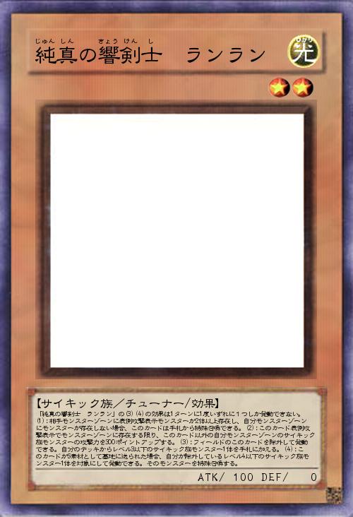 | 「純真の響剣士 ランラン」の(3)(4)の効果は1ターンに1度いずれに1つしか発動できない。(1):相手モンスターゾーンに表側攻撃表示モンスターが2体以上存在し、自分モンスターゾーンにモンスターが存在しない場合、このカードは手札から特殊召喚できる。(2):このカード表側攻撃表示でモンスターゾーンに存在する限り、このカード以外の自分モンスターゾーンのサイキック族モンスターの攻撃力を300ポイントアップする。(3):フィールドのこのカードを除外して発動できる。自分のデッキからレベル3以下のサイキック族モンスター1体を手札に加える。(4):このカードがS素材として墓地に送られた場合、自分が除外しているレベル4以下のサイキック族モンスター1体を対象にして発動できる。そのモンスターを特殊召喚する。 | |||