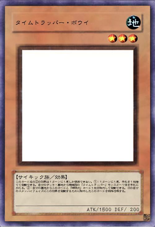 | このカード名の②の効果は1ターンに1度しか使用できない。①:1ターンに1度、手札を1枚捨てて発動できる。自分のデッキ・墓地から機械族の「タイムトラッパー」モンスター1体を手札に加える。②:自分の墓地からこのカードと「時限式」カード1枚を除外して発動できる。次の自分のスタンバイフェイズにこの効果を発動するために除外したこのカードを特殊召喚する。 | |||