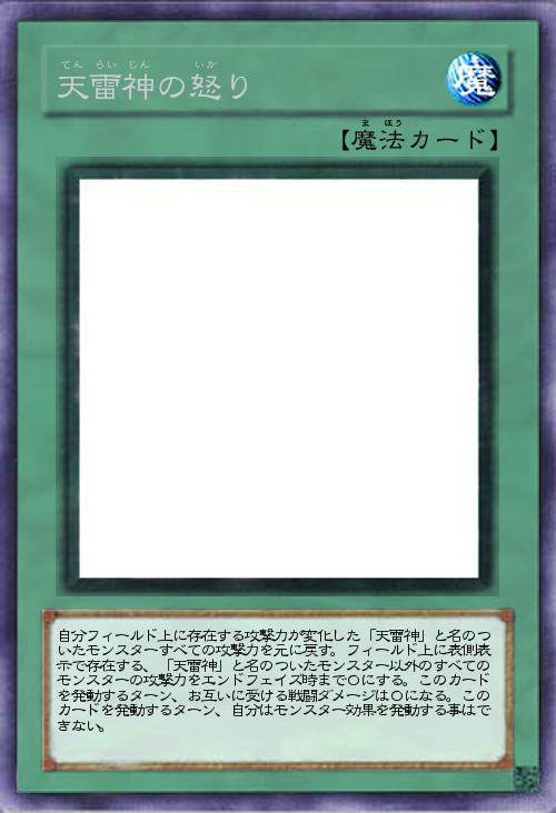 | 自分フィールド上に存在する攻撃力が変化した「天雷神」と名のついたモンスターすべての攻撃力を元に戻す。フィールド上に表側表示で存在する、「天雷神」と名のついたモンスター以外のすべてのモンスターの攻撃力をエンドフェイズ時まで0にする。このカードを発動するターン、お互いに受ける戦闘ダメージは0になる。このカードを発動するターン、自分はモンスター効果を発動する事はできない。 | |||