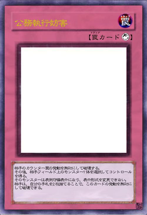 | 相手のカウンター罠の発動を無効にして破壊する。 その後、相手フィールド上のモンスター1体を選択してコントロールを得る。 そのモンスターは表側守備表示になり、表示形式を変更できない。 相手は、自分の手札を2枚捨てることで、このカードの発動を無効にして破壊できる。 | |||