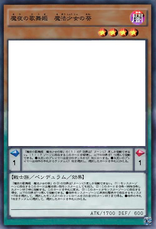 | 「魔夜の歌舞姫 魔法少女の葵」の(3)の効果は1ターンに1度しか発動できない。(1):モンスターゾーンに存在するこのカードは魔法使い族モンスターとしても扱う。(2):このカードを召喚・特殊召喚したターン終了時に発動する。このカードを手札に戻す。(3):このカードがモンスターゾーンに存在する場合、以下の効果を1つ選んで発動できる。●相手モンスターゾーンに表側攻撃表示で存在するモンスター1体を選択して、選択したモンスターのコントロールを次の自分のターン終了まで得る。●相手の手札1枚をランダムに選択して、選択したカードを手札に加える。 | |||