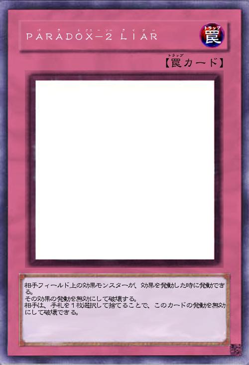 | 相手フィールド上の効果モンスターが、効果を発動した時に発動できる。 その効果の発動を無効にして破壊する。 相手は、手札を1枚選択して捨てることで、このカードの発動を無効にして破壊できる。 | |||