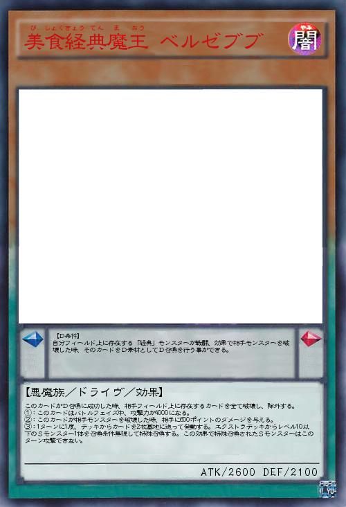 | このカードがD召喚に成功した時、相手フィールド上に存在するカードを全て破壊し、除外する。 ①:このカードはバトルフェイズ中、攻撃力が4000になる。 ②:このカードが相手モンスターを破壊した時、相手に600ポイントのダメージを与える。 ③:1ターンに1度、デッキからカードを2枚墓地に送って発動する。エクストラデッキからレベル10以下のSモンスター1体を召喚条件無視して特殊召喚する。この効果で特殊召喚されたSモンスターはこのターン攻撃できない。 | |||