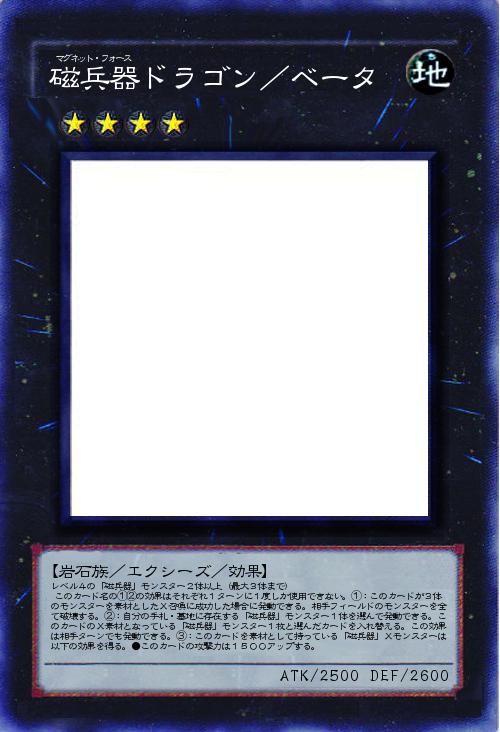 | レベル4の「磁兵器」モンスター2体以上(最大3体まで) このカード名の①②の効果はそれぞれ1ターンに1度しか使用できない。①:このカードが3体のモンスターを素材としたX召喚に成功した場合に発動できる。相手フィールドのモンスターを全て破壊する。②:自分の手札・墓地に存在する「磁兵器」モンスター1体を選んで発動できる。このカードのX素材となっている「磁兵器」モンスター1枚と選んだカードを入れ替える。この効果は相手ターンでも発動できる。③:このカードを素材として持っている「磁兵器」Xモンスターは以下の効果を得る。●このカードの攻撃力は1500アップする。 | |||