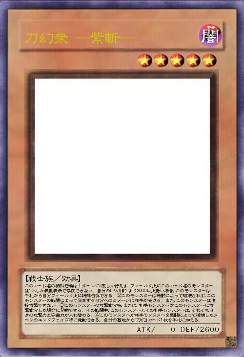 | このカード名の特殊召喚は1ターンに2度しか行えず,フィールド上にこのカード名のモンスターは1体しか表側表示で存在できない.自分のLPが相手より2000以上低い場合,このモンスターは手札から自分フィールド上に特殊召喚できる.②このモンスターは戦闘によって破壊されず,このモンスターの戦闘によって発生する自分へのダメージは相手が受ける.また,このモンスターは直接攻撃できない.③このモンスターの攻撃宣言時,または,相手モンスターがこのモンスターに攻撃宣言した場合に発動できる.その戦闘中,このモンスターとその相手モンスターは,それぞれ自身の攻撃力と守備力が入れ替わる.④このモンスターが相手モンスターを戦闘によって破壊したターンのエンドフェイズ時に発動できる.自分の墓地から「刀幻」カード1枚を手札に加える. | |||