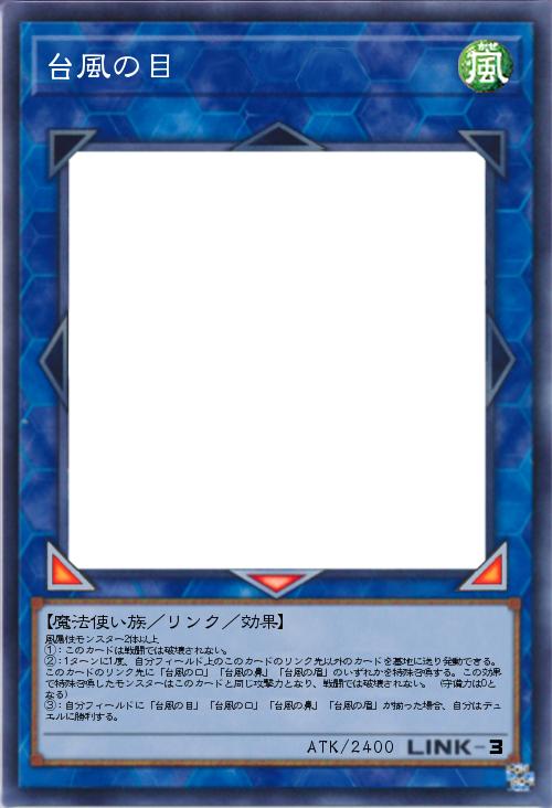 | 風属性モンスター2体以上 ①:このカードは戦闘では破壊されない。 ②:1ターンに1度、自分フィールド上のこのカードのリンク先以外のカードを墓地に送り発動できる。このカードのリンク先に「台風の口」「台風の鼻」「台風の眉」のいずれかを特殊召喚する。この効果で特殊召喚したモンスターはこのカードと同じ攻撃力となり、戦闘では破壊されない。(守備力は0となる) ③:自分フィールドに「台風の目」「台風の口」「台風の鼻」「台風の眉」が揃った場合、自分はデュエルに勝利する。 | |||