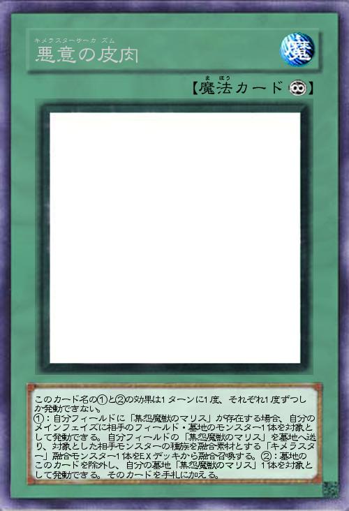 | このカード名の①と②の効果は1ターンに1度、それぞれ1度ずつしか発動できない。 ①:自分フィールドに「集怨魔獣のマリス」が存在する場合、自分のメインフェイズに相手のフィールド・墓地のモンスター1体を対象として発動できる。自分フィールドの「集怨魔獣のマリス」を墓地へ送り、対象とした相手モンスターの種族を融合素材とする「キメラスター」融合モンスター1体をEXデッキから融合召喚する。②:墓地のこのカードを除外し、自分の墓地「集怨魔獣のマリス」1体を対象として発動できる。そのカードを手札に加える。 | |||