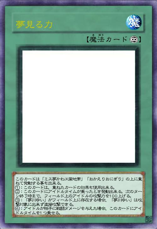| このカードは「ミス夢かわ工業地帯」「おかえりおにぎり」の上に重ねて発動する事も出来る。 ①:このカードは、重ねたカードの効果も使用出来る。 ②:このカードにアイドルタイムが乗ったとき発動出来る。次のターン終了時まで、フィールド上のアイドルの攻撃力を100上げる。 ③:「夢川ゆい」がフィールド上に存在する場合、「夢川ゆい」は攻撃対象に出来ず直接攻撃できる。 ④:アイドルが相手に戦闘ダメージを与えた場合、このカードにアイドルタイムを1つ乗せる。 | |||