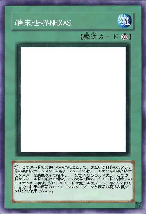 | ①:このカードの発動時の効果処理として、お互いは自身のEXデッキの裏側表示モンスターの数が5体になる様にEXデッキの裏側表示モンスターを裏側表示で除外し、自分は4000LP失う。このカードがフィールドを離れた場合、この効果で除外したカードを持ち主のEXデッキに戻す。②:このカードが魔法&罠ゾーンに存在する限り、自分・相手の両端のメインモンスターゾーンと両端の魔法&罠ゾーンは全て使用できない。 | |||