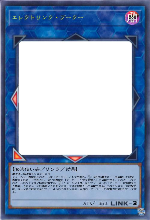 | 魔法使い族通常モンスター×3 フィールド・墓地のこのカードは「ブークー」としても扱う。①:自分が魔法カードを発動した場合、墓地のそのカードを除外し、自分の墓地の「ブークー」1体を対象として発動できる。そのカードをこのカードのリンク先に特殊召喚する。②:1ターンに1度、自分フィールドの「ブークー」が戦闘を行う場合、そのダメージ計算時にそのモンスター1体を対象として発動できる。そのモンスターの攻撃力は、ターン終了時まで自分フィールドのそのモンスター以外の「ブークー」の攻撃力の合計分アップする。 | |||