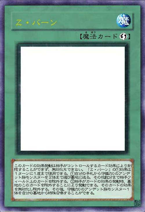 「前に投降した「Z・バーン」の①効果が「墓地から墓地に送る」というとんでもないテキストにミスをしてしまい、「手札から墓地に送る」に改訂しました。ついでに3枚のところを2枚に減らしました。」(2017-10-27 21:25)