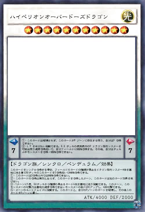 | このカードをシンクロ召喚する場合、フィールドのカードの種類が異なるドラゴン族モンスター4体を墓地に送る事でEXデッキのこのカードをS召喚扱いで特殊召喚できる。 ①:このカードはS召喚以外では特殊召喚できない。 ②:このカードの召喚は無効とならず、このカードを召喚したターン、このカードは他のカード効果を受けない。 ③:1ターンに1度、EXデッキから種類の異なるカード4枚を墓地に送り発動できる。このターン、このモンスターの攻撃力は墓地の通常召喚できないモンスターの数×200アップし、4回攻撃できる。 ④:ターンのエンドフェイズに発動する。このカードと、自分のPゾーンのカードを破壊し、その後このカードをPゾーンに置く。 | |||
