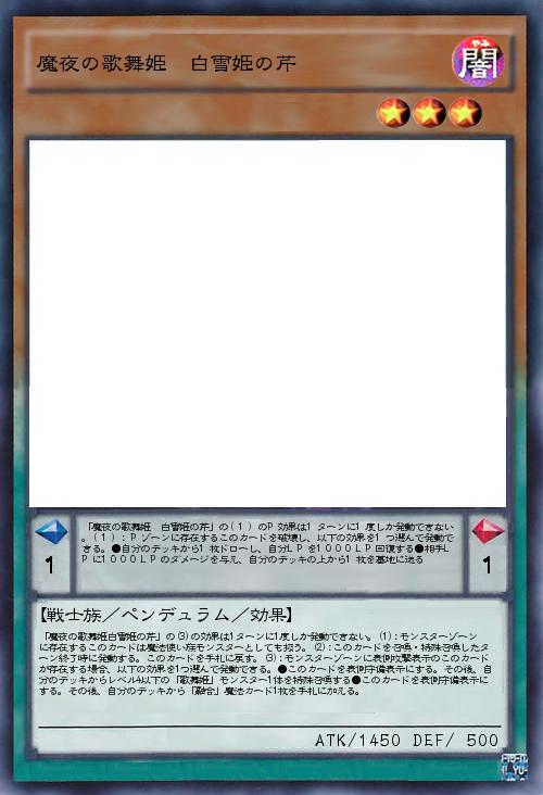 | 「魔夜の歌舞姫 白雪姫の芹」の(1)のP効果は1ターンに1度しか発動できない。(1):Pゾーンに存在するこのカードを破壊し、以下の効果を1つ選んで発動できる。●自分のデッキから1枚ドローし、自分LPを1000LP回復する●相手LPに1000LPのダメージを与え、自分のデッキの上から1枚を墓地に送る | |||