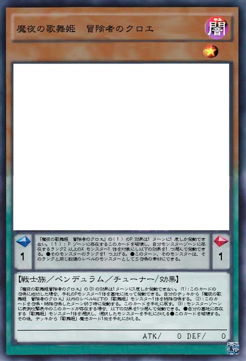 | 「魔夜の歌舞姫冒険者のクロエ」の(3)の効果は1ターンに1度しか発動できない。(1):このカードの召喚に成功した場合、手札のPモンスター1体を墓地に送って発動できる。自分のデッキから「魔夜の歌舞姫 冒険者のクロエ」以外のレベル4以下の「歌舞姫」モンスター1体を特殊召喚する。(2):このカードを召喚・特殊召喚したターン終了時に発動する。このカードを手札に戻す。(3):モンスターゾーンに表側攻撃表示のこのカードが存在する場合、以下の効果を1つ選んで発動できる。●自分の墓地に存在する「歌舞姫」モンスター1体を選択し、選択したモンスターを手札に加える●このカードを破壊する。その後、デッキから「歌舞姫」魔法カード1枚を手札に加える。 | |||