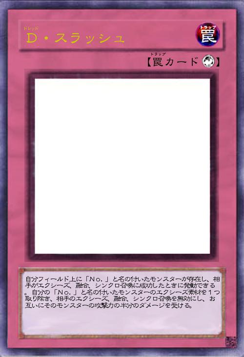 | 自分フィールド上に「No.」と名の付いたモンスターが存在し、相手がエクシーズ、融合、シンクロ召喚に成功したときに発動できる。自分の「No.」と名の付いたモンスターのエクシーズ素材を1つ取り除き、相手のエクシーズ、融合、シンクロ召喚を無効にし、お互いにそのモンスターの攻撃力の半分のダメージを受ける。 | |||