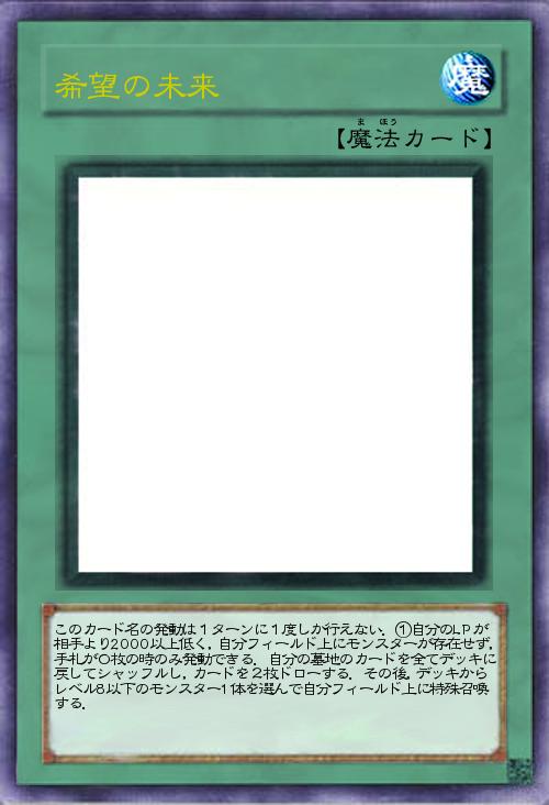 | このカード名の発動は1ターンに1度しか行えない.①自分のLPが相手より2000以上低く,自分フィールド上にモンスターが存在せず,手札が0枚の時のみ発動できる.自分の墓地のカードを全てデッキに戻してシャッフルし,カードを2枚ドローする.その後,デッキからレベル8以下のモンスター1体を選んで自分フィールド上に特殊召喚する. | |||
