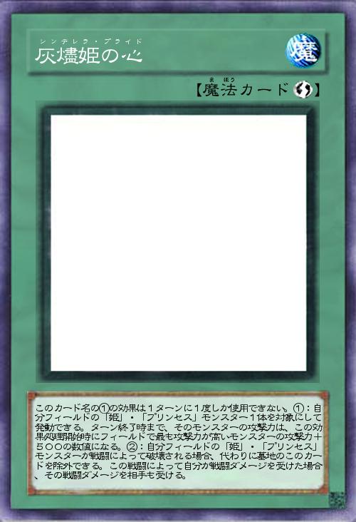 | このカード名の①の効果は1ターンに1度しか使用できない。①:自分フィールドの「姫」・「プリンセス」モンスター1体を対象にして発動できる。ターン終了時まで、そのモンスターの攻撃力は、この効果処理開始時にフィールドで最も攻撃力が高いモンスターの攻撃力+500の数値になる。②:自分フィールドの「姫」・「プリンセス」モンスターが戦闘によって破壊される場合、代わりに墓地のこのカードを除外できる。この戦闘によって自分が戦闘ダメージを受けた場合、その戦闘ダメージを相手も受ける。 | |||