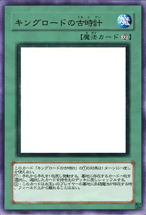 | このカード「キングロードの古時計」の①の効果は1ターンに一度しか使えない。 ①:手札から手札を1枚戻し発動する。墓地に存在するカード一枚を選択し、選択したカードを持ち主のデッキに戻しシャッフルする。 ②:このカードはお互いのプレイヤーの墓地に永続魔法が存在する時、フィールド上から離れることはない。 | |||