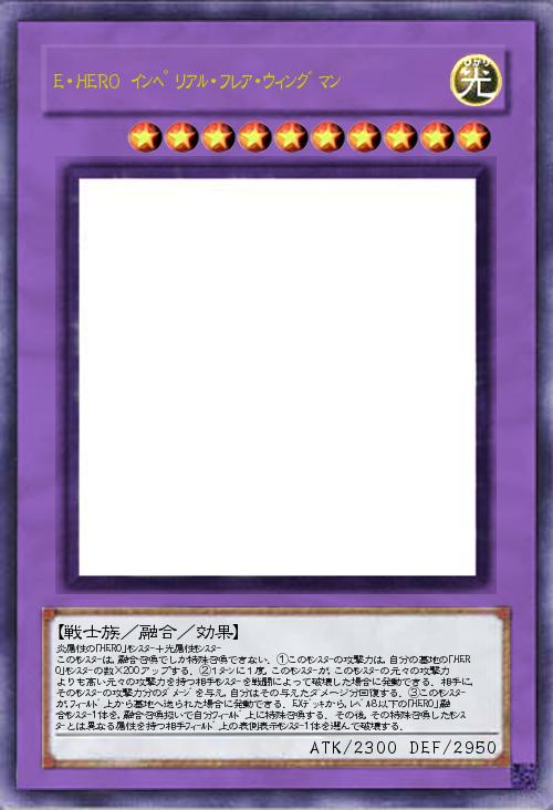 | 炎属性の「HERO」モンスタ-+光属性モンスタ- このモンスタ-は,融合召喚でしか特殊召喚できない.①このモンスタ-の攻撃力は,自分の墓地の「HERO」モンスタ-の数×200アップする.②1タ-ンに1度,このモンスタ-が,このモンスタ-の元々の攻撃力よりも高い元々の攻撃力を持つ相手モンスタ-を戦闘によって破壊した場合に発動できる.相手に,そのモンスタ-の攻撃力分のダメ-ジを与え,自分はその与えたダメージ分回復する.③このモンスタ-が,フィ-ルド上から墓地へ送られた場合に発動できる.EXデッキから,レベル8以下の「HERO」融合モンスタ-1体を,融合召喚扱いで自分フィ-ルド上に特殊召喚する.その後,その特殊召喚したモンスタ-とは異なる属性を持つ相手フィ-ルド上の表側表示モンスタ-1体を選んで破壊する. | |||