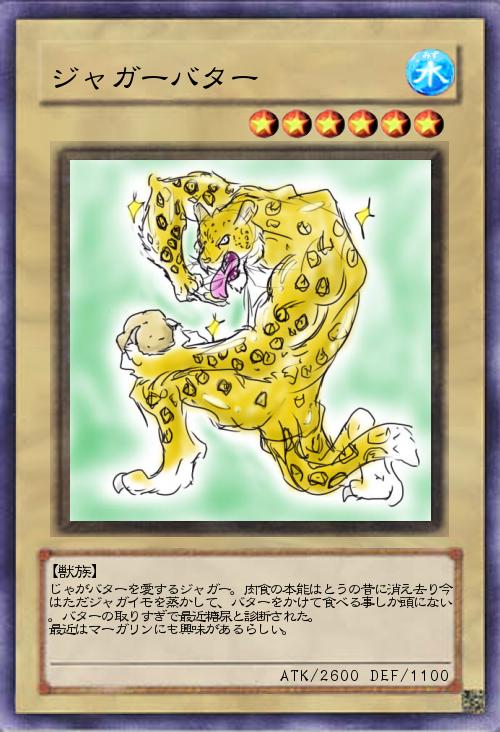 | じゃがバターを愛するジャガー。肉食の本能はとうの昔に消え去り今はただジャガイモを蒸かして、バターをかけて食べる事しか頭にない。バターの取りすぎで最近糖尿と診断された。 最近はマーガリンにも興味があるらしい。 | |||