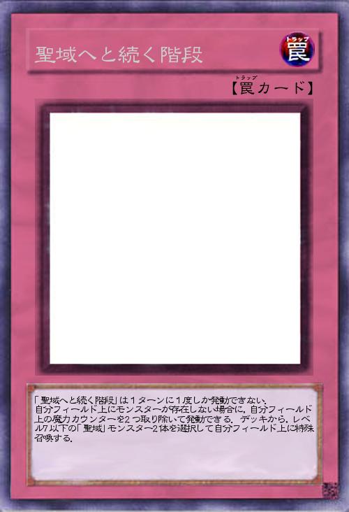 | 「聖域へと続く階段」は1ターンに1度しか発動できない. 自分フィールド上にモンスターが存在しない場合に,自分フィールド上の魔力カウンターを2つ取り除いて発動できる.デッキから,レベル7以下の「聖域」モンスター2体を選択して自分フィールド上に特殊召喚する. | |||