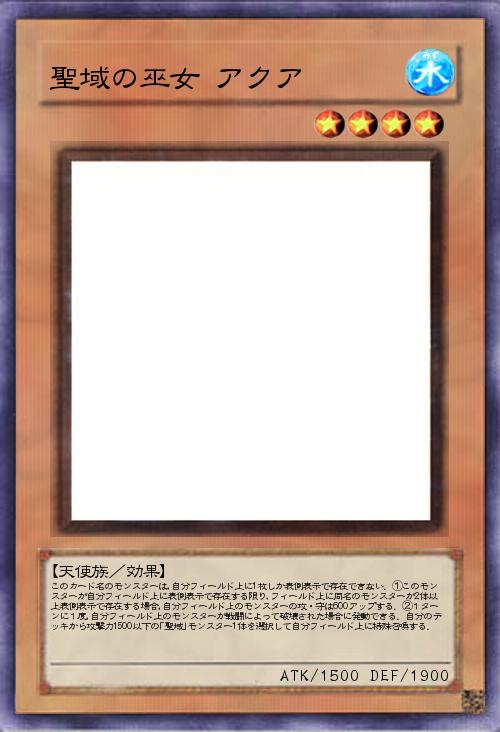 | このカード名のモンスターは,自分フィールド上に1枚しか表側表示で存在できない.①このモンスターが自分フィールド上に表側表示で存在する限り,フィールド上に同名のモンスターが2体以上表側表示で存在する場合,自分フィールド上のモンスターの攻・守は600アップする.②1ターンに1度,自分フィールド上のモンスターが戦闘によって破壊された場合に発動できる.自分のデッキから攻撃力1500以下の「聖域」モンスター1体を選択して自分フィールド上に特殊召喚する. | |||