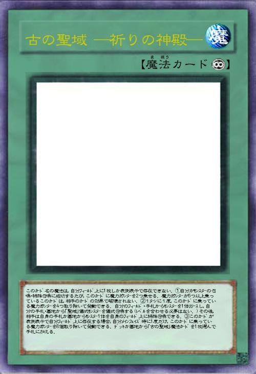 | このカ-ド名の魔法は,自分フィ-ルド上に1枚しか表側表示で存在できない.①自分がモンスタ-の召喚・特殊召喚に成功するたび,このカ-ドに魔力カウンタ-を2つ乗せる.魔力カウンタ-が6つ以上乗っているこのカ-ドは,相手のカ-ドの効果で破壊されない.②1タ-ンに1度,このカ-ドに乗っている魔力カウンタ-を4つ取り除いて発動できる.自分のフィ-ルド・手札からモンスタ-を1体リリ-スし,自分の手札・墓地から「聖域」儀式モンスタ-を儀式召喚する(レベルを合わせる必要はない.)その後,相手は自身の手札か墓地からモンスタ-1体を自身のフィ-ルド上に特殊召喚できる.③このカ-ドが表側表示で自分フィ-ルド上に存在する場合,自分メインフェイズ時に1度だけ,このカ-ドに乗っている魔力カウンタ-を8個取り除いて発動できる.デッキか墓地から「古の聖域」魔法カ-ドを1枚選んで手札に加える. | |||