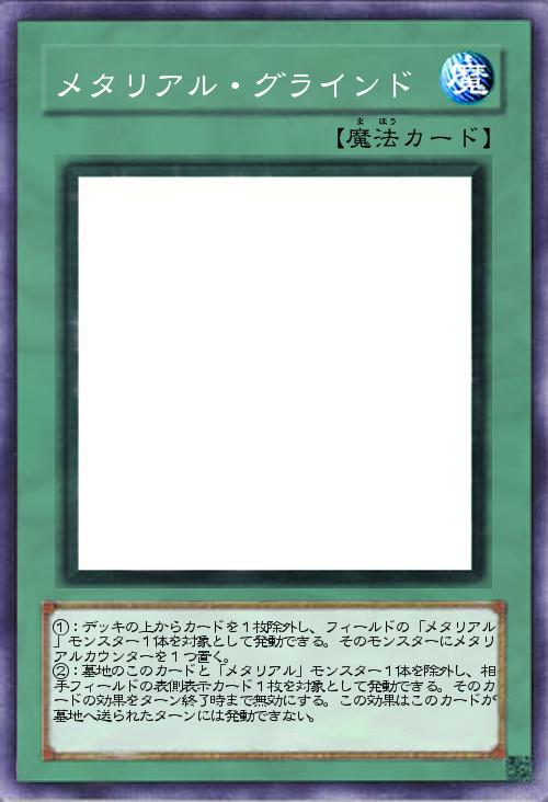 | ①:デッキの上からカードを1枚除外し、フィールドの「メタリアル」モンスター1体を対象として発動できる。そのモンスターにメタリアルカウンターを1つ置く。 ②:墓地のこのカードと「メタリアル」モンスター1体を除外し、相手フィールドの表側表示カード1枚を対象として発動できる。そのカードの効果をターン終了時まで無効にする。この効果はこのカードが墓地へ送られたターンには発動できない。 | |||
