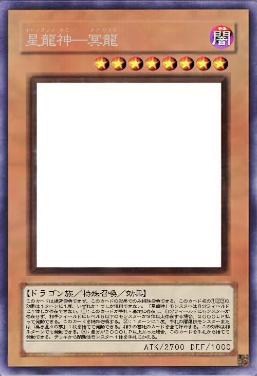| このカードは通常召喚できず、このカードの効果でのみ特殊召喚できる。このカード名の①②③の効果は1ターンに1度、いずれか1つしか使用できない。「星龍神」モンスターは自分フィールドに1体しか存在できない。①:このカードが手札・墓地に存在し、自分フィールドにモンスターが存在せず、相手フィールドにレベル6以下のモンスターが3体以上存在する場合、2000LP払って発動できる。このカードを特殊召喚する。②:1ターンに1度、手札の闇属性モンスターまたは「黒き星々の夢」1枚を捨てて発動できる。相手の墓地のカードを全て除外する。この効果は相手ターンでも発動できる。③:自分が2000LP以上払った場合、このカードを手札から捨てて発動できる。デッキから闇属性モンスター1体を手札に加える。 | |||