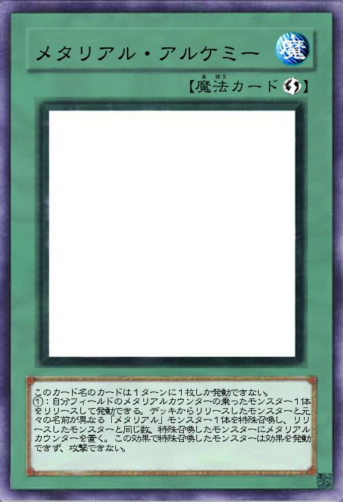 | このカード名のカードは1ターンに1枚しか発動できない。 ①:自分フィールドのメタリアルカウンターの乗ったモンスター1体をリリースして発動できる。デッキからリリースしたモンスターと元々の名前が異なる「メタリアル」モンスター1体を特殊召喚し、リリースしたモンスターと同じ数、特殊召喚したモンスターにメタリアルカウンターを置く。この効果で特殊召喚したモンスターは効果を発動できず、攻撃できない。 | |||