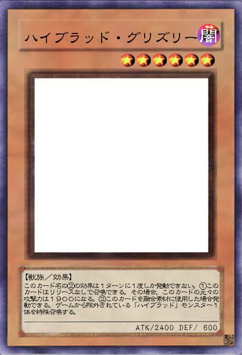 | このカード名の②の効果は1ターンに1度しか発動できない。①このカードはリリースなしで召喚できる。その場合、このカードの元々の攻撃力は1900になる。②このカードを融合素材に使用した場合発動できる。ゲームから除外されている「ハイブラッド」モンスター1体を特殊召喚する。 | |||
