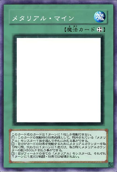 | このカード名のカードは1ターンに1枚しか発動できない。 ①:このカードの発動時の効果処理として、除外されている「メタリアル」モンスター1体を選んで手札に加える事ができる。 ②:自分がカードの効果を発動するためにメタリアルカウンターを取り除く際、代わりに1ターンに1度だけ、取り除くメタリアルカウンターの数×800LPを払う事ができる。 ③:自分フィールドの全ての「メタリアル」モンスターは、それぞれ1ターンに1度だけ戦闘・効果では破壊されない。 | |||