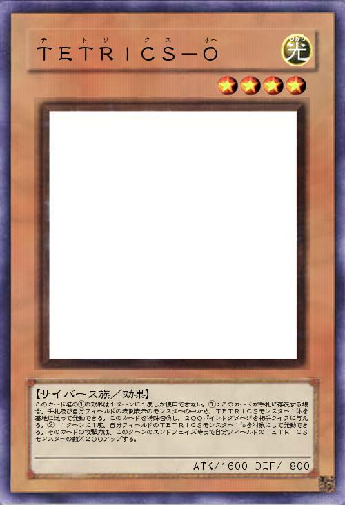 | このカード名の①の効果は1ターンに1度しか使用できない。①:このカードが手札に存在する場合、手札及び自分フィールドの表側表示のモンスターの中から、TETRICSモンスター1体を墓地に送って発動できる。このカードを特殊召喚し、200ポイントダメージを相手ライフに与える。②:1ターンに1度、自分フィールドのTETRICSモンスター1体を対象にして発動できる。そのカードの攻撃力は、このターンのエンドフェイズ時まで自分フィールドのTETRICSモンスターの数×200アップする。 | |||