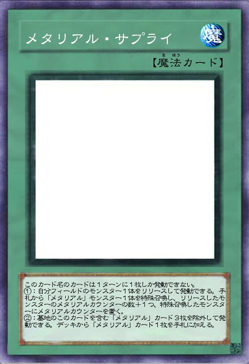 | このカード名のカードは1ターンに1枚しか発動できない。 ①:自分フィールドのモンスター1体をリリースして発動できる。手札から「メタリアル」モンスター1体を特殊召喚し、リリースしたモンスターのメタリアルカウンターの数+1つ、特殊召喚したモンスターにメタリアルカウンターを置く。 ②:墓地のこのカードを含む「メタリアル」カード3枚を除外して発動できる。デッキから「メタリアル」カード1枚を手札に加える。 | |||