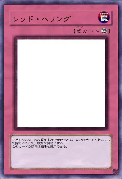 | 相手モンスターの攻撃宣言時に発動できる。自分の手札を1枚選択して捨てることで、攻撃を無効にする。 このカードの効果は相手も使用できる。 | |||