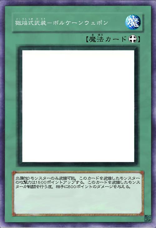 | 炎属性Dモンスターのみ装備可能。このカードを装備したモンスターの攻撃力は1500ポイントアップする。このカードを装備したモンスターが戦闘を行う度、相手に800ポイントのダメージを与える。 | |||