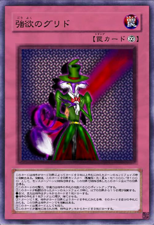 | このカードは相手がカード効果によってカードを3枚以上手札に加えたターンのエンドフェイズ時に発動出来る。発動後、このカードを効果モンスター(悪魔族・光・星4・攻1000/守1000)として、モンスターゾーンに特殊召喚する。この効果で特殊召喚したこのカードは以下の効果を得る。 ①このカードの攻撃力、守備力は相手の手札の枚数×600ポイントアップする。 ②このカードが戦闘を行ったターンのエンドフェイズ時に、以下の効果から1つを選び発動する。 ●自分、または相手はデッキからカードを1枚ドローする。 ●相手の手札を1枚ランダムに選び、捨てさせる。 ③1ターンに1度、相手がカード効果によりカードを手札に加える時、そのカードを自分の手札に加える。この効果は相手ターンでも発動出来る。 ④このカードは罠カードとしても扱う。 ⑤このカードが墓地に送られた時、相手はデッキからカードを3枚ドローする。 | |||