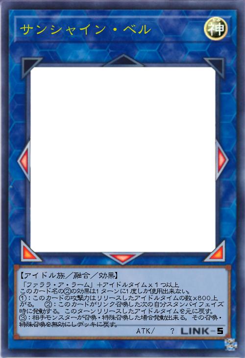 | 「ファララ・ア・ラーム」+アイドルタイムx1つ以上 このカード名の②の効果は1ターンに1度しか使用出来ない。 ①:このカードの攻撃力はリリースしたアイドルタイムの数x800上がる。 ②:このカードがリンク召喚した次の自分スタンバイフェイズ時に発動する。このターンリリースしたアイドルタイムを元に戻す。 ③:相手モンスターが召喚・特殊召喚した場合発動出来る。その召喚・特殊召喚を無効にしデッキに戻す。 | |||