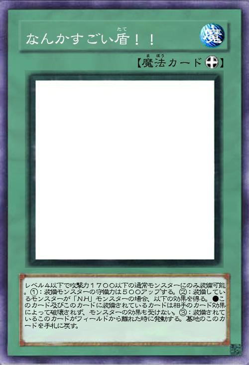 | レベル4以下で攻撃力1700以下の通常モンスターにのみ装備可能。①:装備モンスターの守備力は500アップする。②:装備しているモンスターが「NH」モンスターの場合、以下の効果を得る。●このカード及びこのカードに装備されているカードは相手のカード効果によって破壊されず、モンスターの効果も受けない。③:装備されているこのカードがフィールドから離れた時に発動する。墓地のこのカードを手札に戻す。 | |||