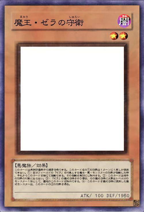 レベル2で守備力1950は最近でも2000がいたりするのでありきたりだが、守衛だからか効果の対象になるのを弾き、手札誘発で「ゼラ」を護った上で除外と非常に強力な手札誘発。発動には「魔王」が場にいることが条件なものの、魔王・ゼラ兵の連携力で手札に備えておきたいところ。