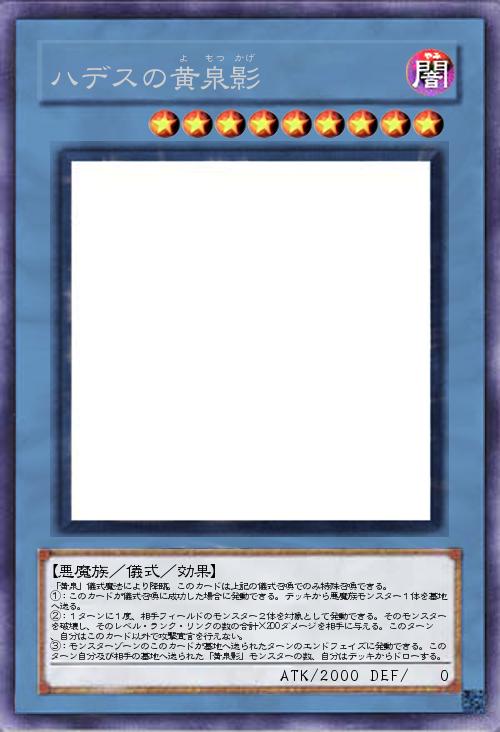 | 「黄泉」儀式魔法により降臨。このカードは上記の儀式召喚でのみ特殊召喚できる。 ①:このカードが儀式召喚に成功した場合に発動できる。デッキから悪魔族モンスター1体を墓地へ送る。 ②:1ターンに1度、相手フィールドのモンスター2体を対象として発動できる。そのモンスターを破壊し、そのレベル・ランク・リンクの数の合計×200ダメージを相手に与える。このターン、自分はこのカード以外で攻撃宣言を行えない。 ③:モンスターゾーンのこのカードが墓地へ送られたターンのエンドフェイズに発動できる。このターン自分及び相手の墓地へ送られた「黄泉影」モンスターの数、自分はデッキからドローする。 | |||