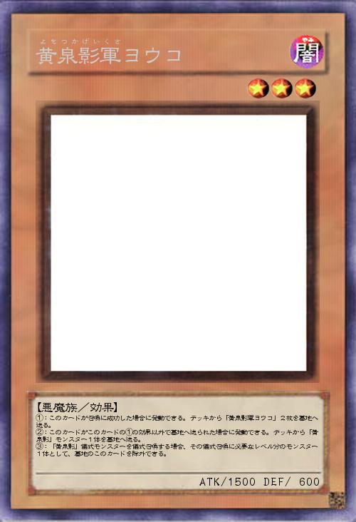 | ①:このカードが召喚に成功した場合に発動できる。デッキから「黄泉影軍ヨウコ」2枚を墓地へ送る。 ②:このカードがこのカードの①の効果以外で墓地へ送られた場合に発動できる。デッキから「黄泉影」モンスター1体を墓地へ送る。 ③:「黄泉影」儀式モンスターを儀式召喚する場合、その儀式召喚に必要なレベル分のモンスター1体として、墓地のこのカードを除外できる。 | |||