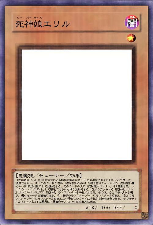 | 「死神娘エリル」の(3)の方法による特殊召喚及び(1)(2)の効果はそれぞれ1ターンに1度しか使用できない。(1):このカードが召喚・特殊召喚に成功した場合自分フィールドの「死神娘」魔法カード1枚を対象にして発動できる。そのカードの上に「死神娘カウンター」を1個乗せる。(2):このカードがS素材として墓地に送られた場合発動できる。自分のデッキから「死神娘エリル」以外のレベル3以下の「死神娘」モンスター1体を手札に加える。その後、自分の手札1枚を選び、選んだカードを墓地に送る。(3):相手のモンスターゾーンにモンスターが存在し、自分のモンスターゾーンにモンスターが存在しない場合このカードは手札から特殊召喚できる。その後デッキからレベル3以下の闇属性・悪魔族モンスター1体を墓地に送る。 | |||