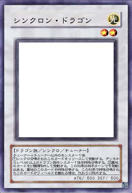 | チューナー+チューナー以外のモンスター1体 ①シンクロ召喚されたこのカードをリリースして発動する。デッキからレベル5以上のドラゴン族モンスター1体を特殊召喚する。②墓地のカードを2種類除外して発動する。この効果は相手ターンでも発動出来る。墓地のこのカードを特殊召喚する。この効果で特殊召喚されたこのカードがフィールドを離れる場合、代わりに除外する。 | |||