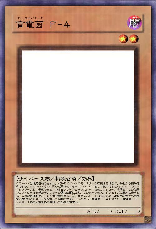 | このカードは通常召喚できない。相手EXゾーンにモンスターが存在する場合に、手札から特殊召喚できる。このカード名の①②の効果はそれぞれ1ターンに1度しか使用できない。①:このカードをリリースして発動できる。相手EXゾーンのモンスター1体のコントロールを得る。この効果でコントロールを得たモンスターの属性は闇になり、このターンのエンドフェイズに墓地に送られる。この効果は相手ターンでも発動できる。②:相手EXゾーンにモンスターが特殊召喚された場合に墓地のこのカードを除外して発動できる。デッキから「盲電菌 F-4」以外の「盲電菌」モンスター1体を召喚条件を無視して特殊召喚する。 | |||
