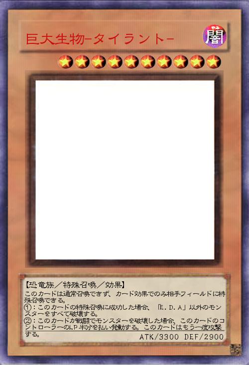 | このカードは通常召喚できず、カード効果でのみ相手フィールドに特殊召喚できる。 ①:このカードの特殊召喚に成功した場合、「E.D.A」以外のモンスターをすべて破壊する。 ②:このカードが戦闘でモンスターを破壊した場合、このカードのコントローラーのLP半分を払い発動する。このカードはもう一度攻撃する。 | |||