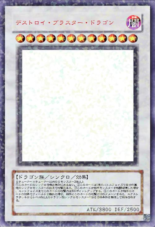 | Sチューナー+チューナー以外のSモンスター2体以上 ①このカードのシンクロ召喚は無効に出来ない。②このカードは1度のバトルフェイズで自分の墓地のシンクロモンスターの数まで攻撃出来る。③このカードが相手モンスターを戦闘破壊した場合、エンドフェイズまでこのカードの攻撃力は500ポイントアップする。④このカードが相手のカードの効果でフィールドを離れた場合、相手にこのカードの攻撃力分のダメージを与え、エクストラデッキからレベル8以上のドラゴン族シンクロモンスター1体を召喚条件を無視して特殊召喚する。 | |||